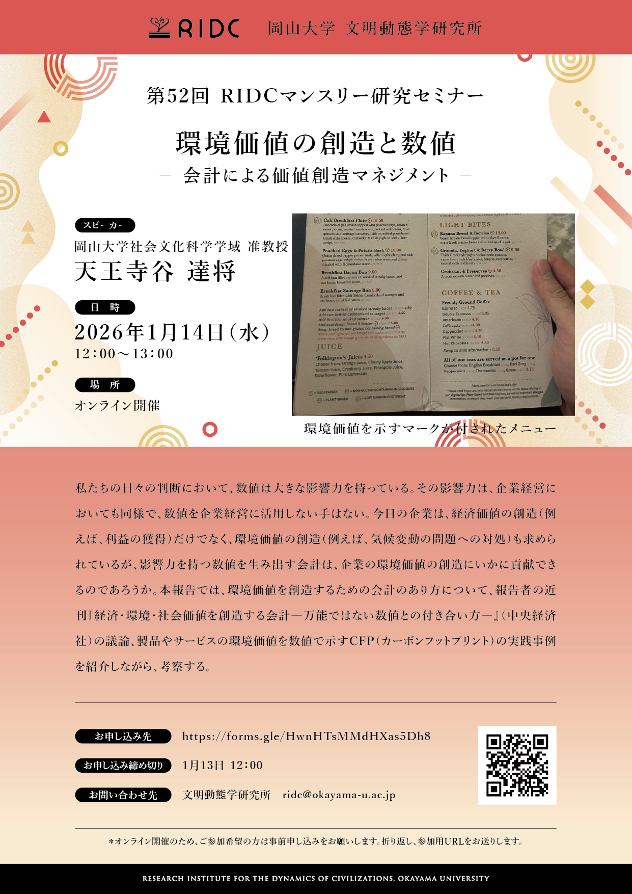 | 【問い合わせ先】 | 岡山大学 文明動態学研究所 ridc@okayama-u.ac.jp |