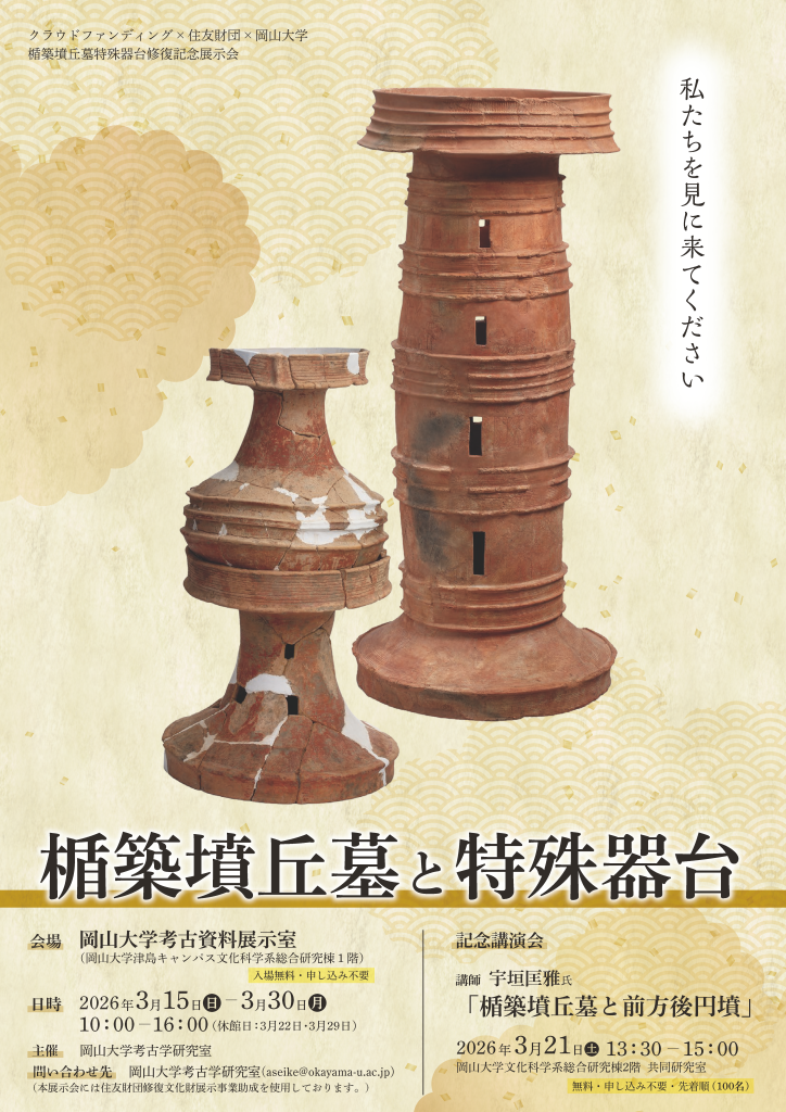 「岡山大学×READYFOR」クラウドファンディングプロジェクト」により修復された楯築墳丘墓特殊器台の展示会と講演会を実施します。
