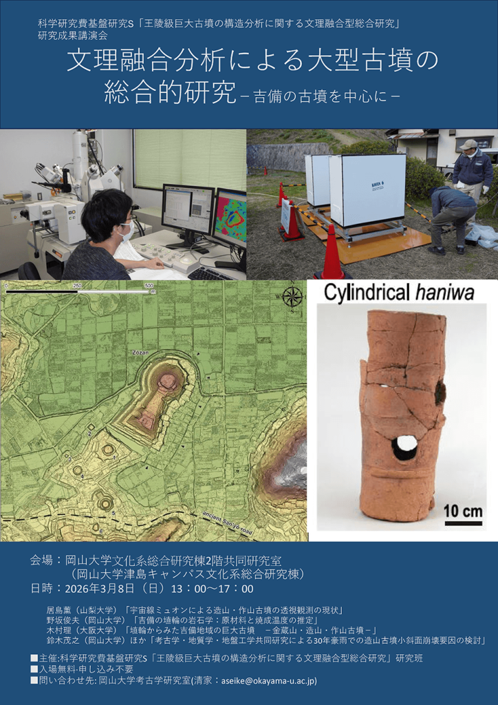 2026年3月8日(日)には成果講演会(シンポジウム形式)「文理融合分析による大型古墳の総合的研究-吉備の古墳を中心に-」を岡山大学文化科学系総合研究棟共同研究室で開催した。各発表題目は以下の通りである。